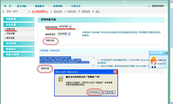 點(diǎn)擊“獲取代碼”按鈕,得到代碼,點(diǎn)擊“復(fù)制代碼”,選“允許訪問”,就把獲取的代碼復(fù)制好了,這時(shí)只要再粘貼“到網(wǎng)站的相關(guān)頁(yè)面的 </html> 的前一行”即可。