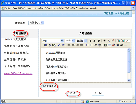 上圖中,如果勾上“顯示源代碼”可編輯 HTML ,信息編寫完后,點(diǎn)擊“修改”按鈕,則在左邊的“介紹欄圖示”欄顯示剛才編輯的效果。