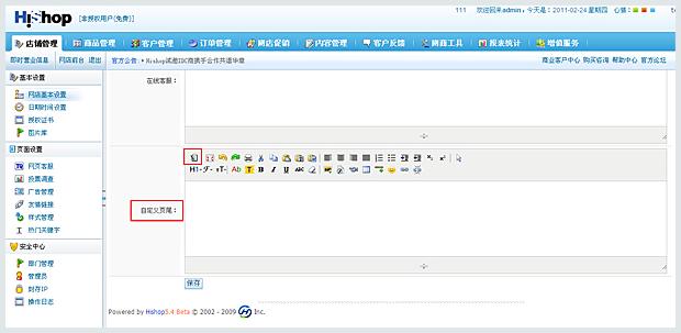 獲取在線客服安裝代碼,然后登陸Hishop后臺,進入店鋪管理》網(wǎng)店基本設(shè)置,找到“自定義頁尾”,點擊“HTML代碼”按鈕,把在線客服代碼復(fù)制粘貼到編輯框,點擊保存。